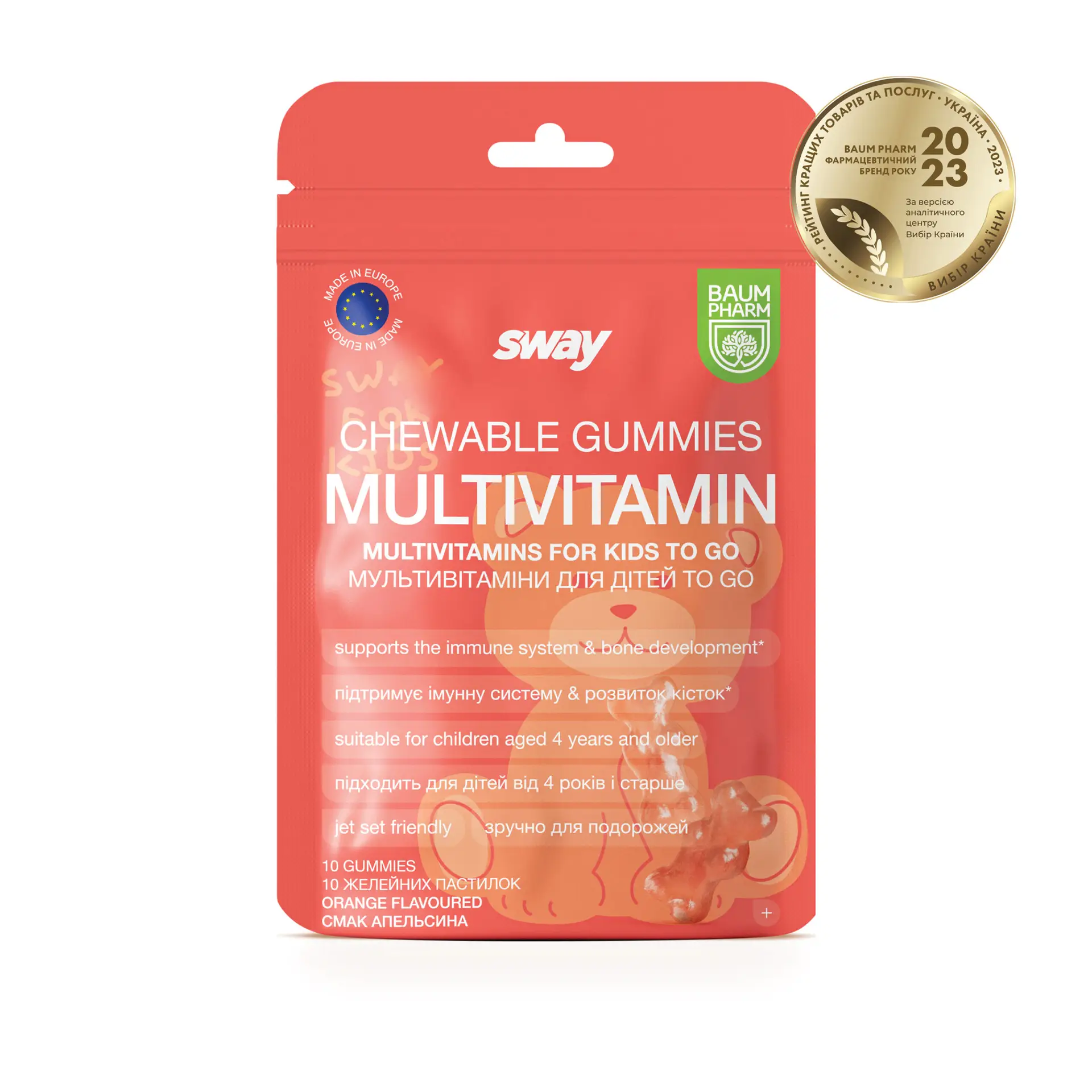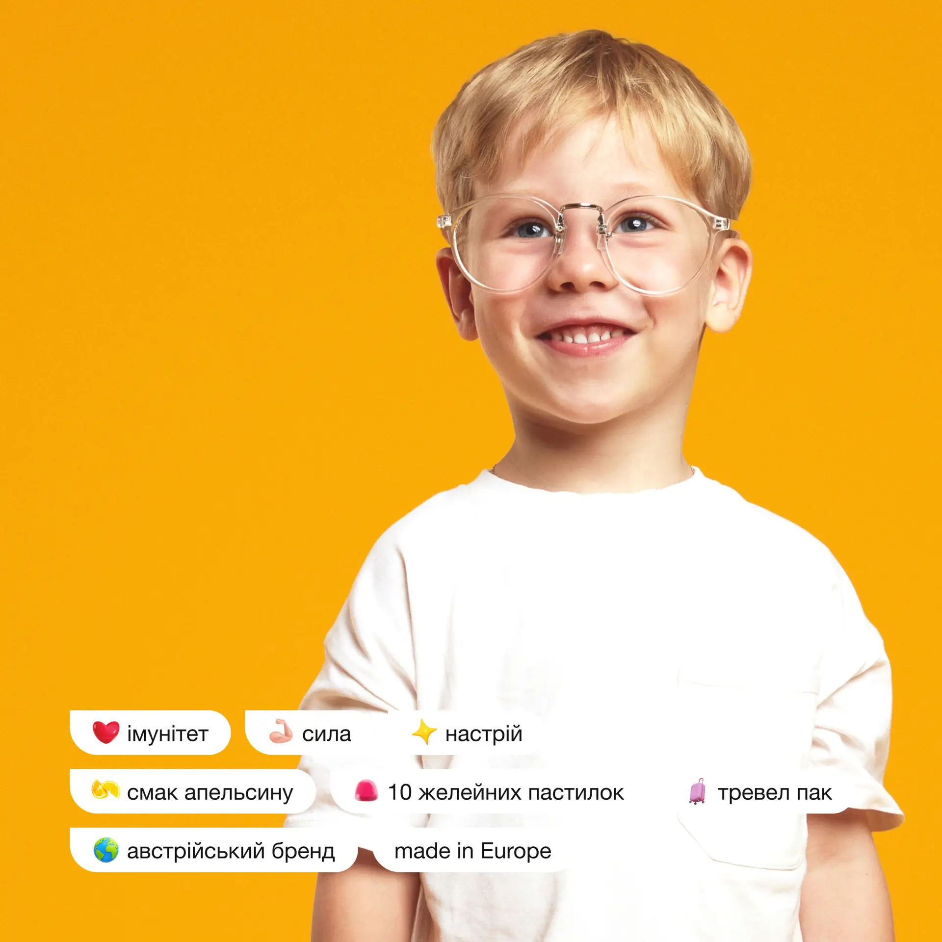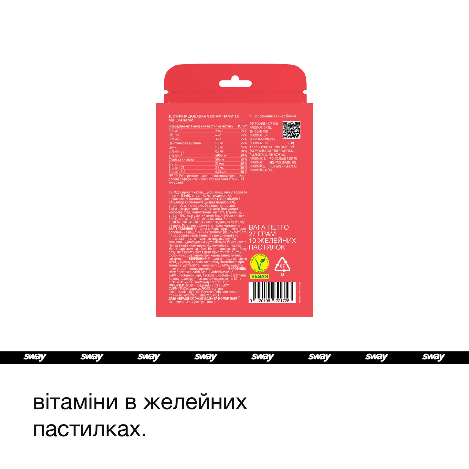 Glucose syrup, sugar, water, gelling agent (pectin), acidulant (citric acid), Vitamin E, Vitamin C, acidity regulator (sodium citrate), coconut oil, Vitamin D, zinc citrate, colorant (paprika extract), natural aroma, iodine, Vitamin A, Vitamin B6, pantothenic acid, anti-caking agent (carnauba wax), Vitamin B12, folic acid, D‑biotin.
