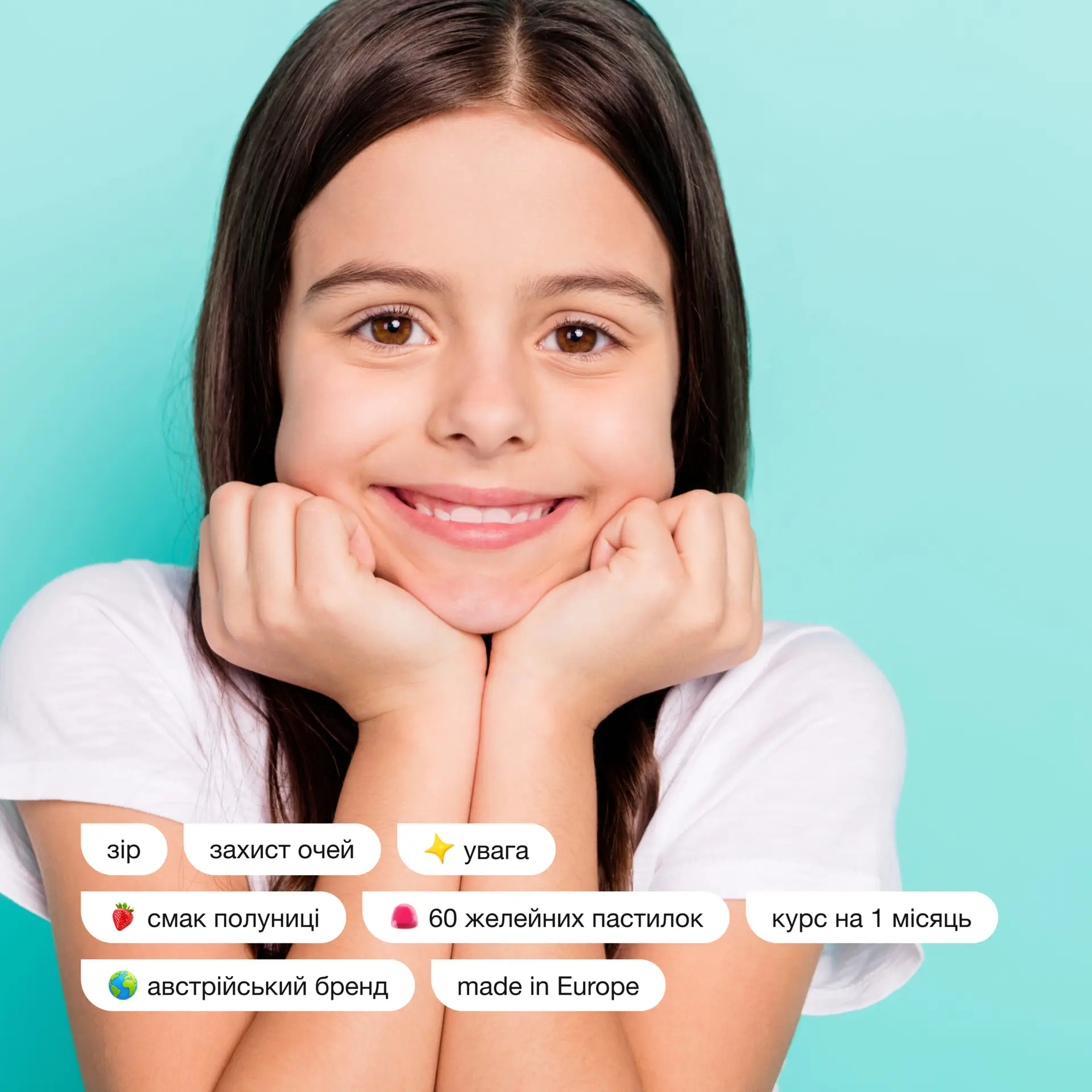 Eye Health Kids gummies provide a carefully formulated blend of vision-supporting nutrients, including lutein and zeaxanthin, two essential carotenoids that help protect the eyes from oxidative stress and blue light damage. Zinc contributes to normal vision by supporting the function of light-sensitive cells, while vitamins C and E provide antioxidant protection against free radicals. With children spending more time in front of screens, this gummy offers a convenient and tasty way to support eye health while ensuring kids get the nutrients they need for optimal vision. Free from gluten, lactose, and GMOs, these gummies are designed to fit seamlessly into a healthy lifestyle.