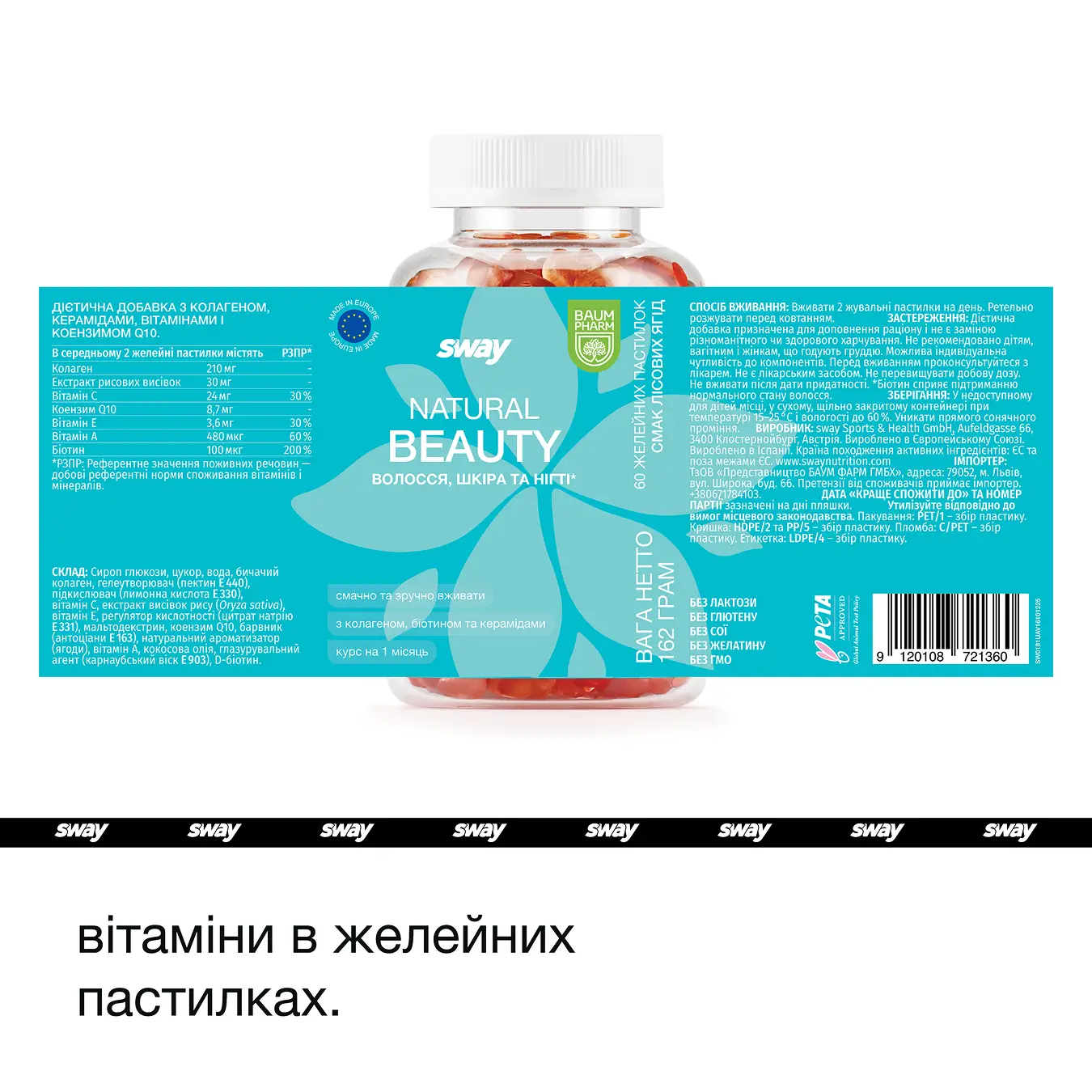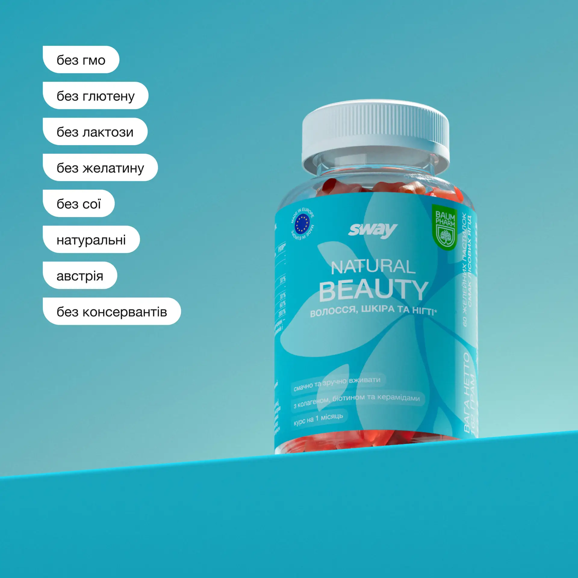 Natural Beauty provides 210 mg of collagen, 30 mg of ceramides, and 100 μg of biotin per serving (2 gummies) to enhance skin hydration, elasticity, and hair strength. Collagen helps maintain skin structure and reduces signs of aging, while ceramides lock in moisture and protect the skin barrier. Biotin, also known as vitamin B7, plays a key role in hair and nail health, preventing brittleness and promoting growth. The formula is enriched with 24 mg of vitamin C (30% NRV) and 3.6 mg of vitamin E (30% NRV) to protect skin cells from oxidative stress and stimulate collagen production. Vitamin A (60% NRV) further supports skin renewal, while coenzyme Q10 helps fight free radicals and maintain a youthful glow.