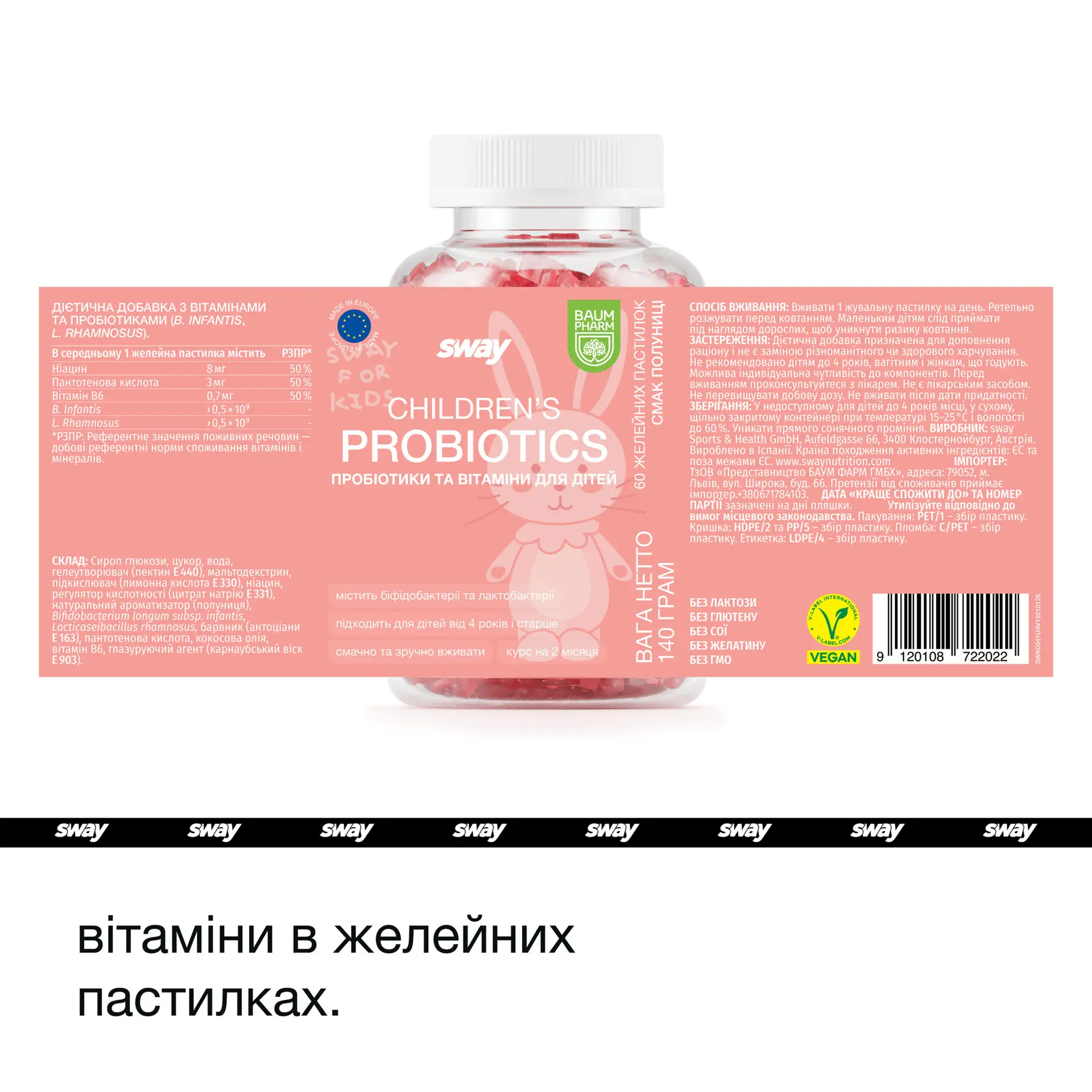 Glucose syrup, sugar, water, gelling agent (pectins), maltodextrin, acidulant (citric acid), niacin, acidity regulator (sodium citrate), natural aroma, bifidobacterium infantis tyndallized, lactobacillus rhamnosus tyndallized, colorant (anthocyanins), pantothenic acid, coconut oil, vitamin B6, anti-caking agent (carnauba wax).