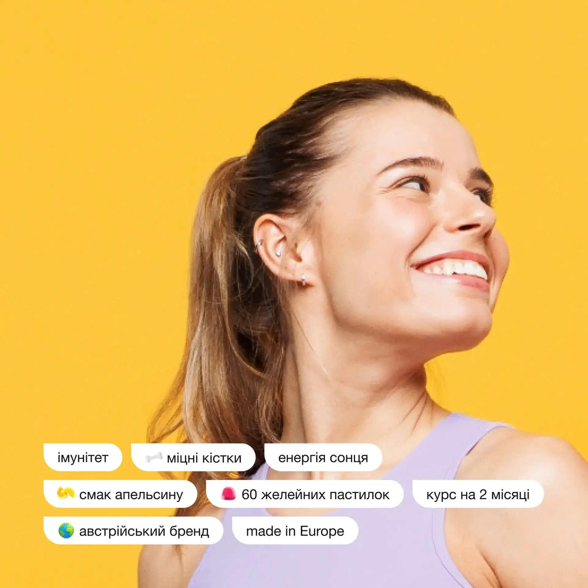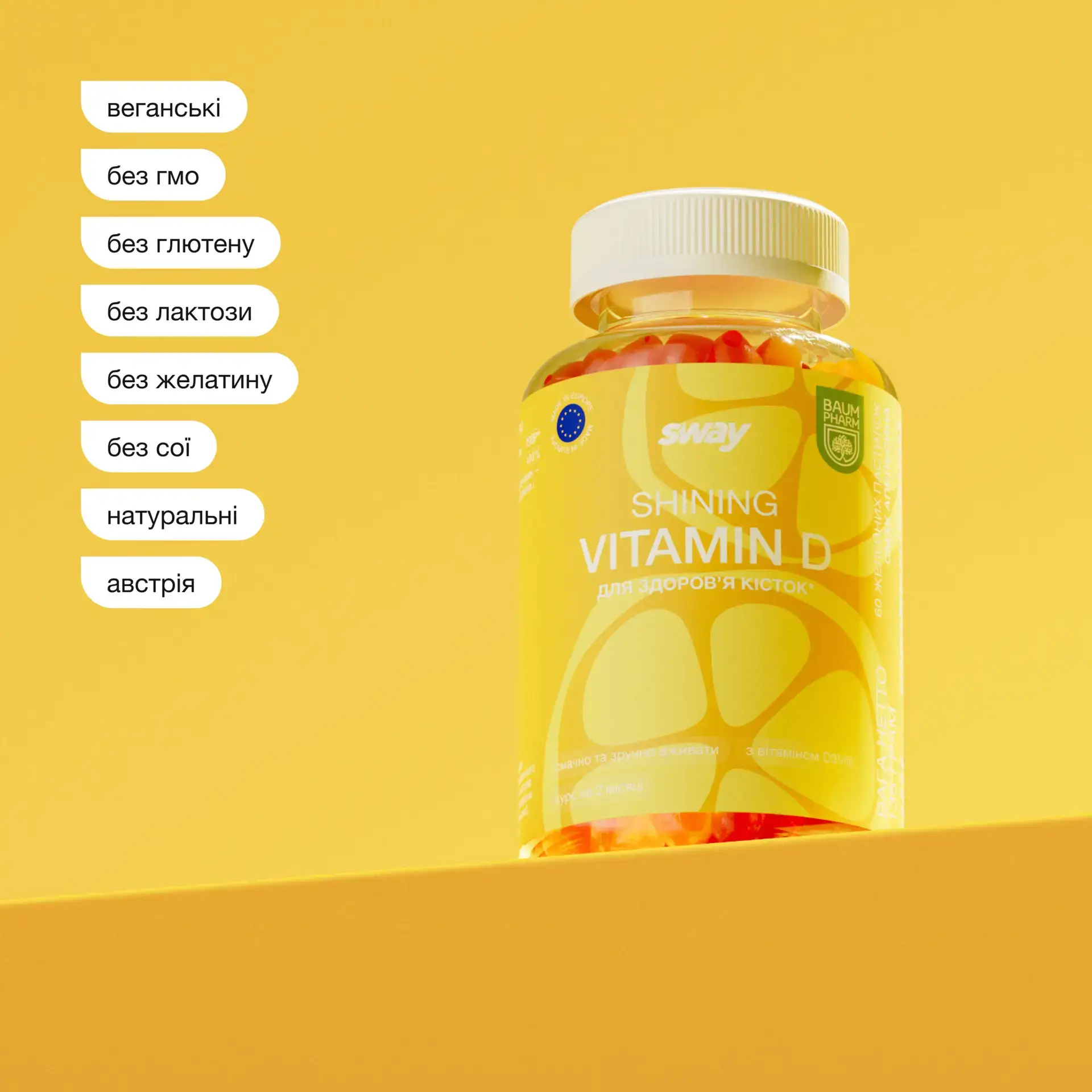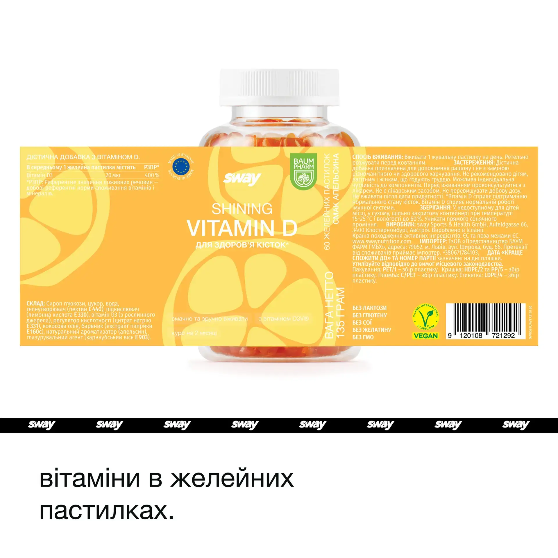 Glucose syrup, sugar, water, gelling agent (pectin), acidulant (citric acid), Vitamin D3V® (corn starch syrup solids, gum arabic, medium-chain triglycerides, silicon dioxide, antioxidant (sodium ascorbate), tocopherol-rich extracts, cholecalciferol), acidity regulator (sodium citrate), coconut oil, colorant (paprika extract), natural aroma, anti-caking agent (carnauba wax).
